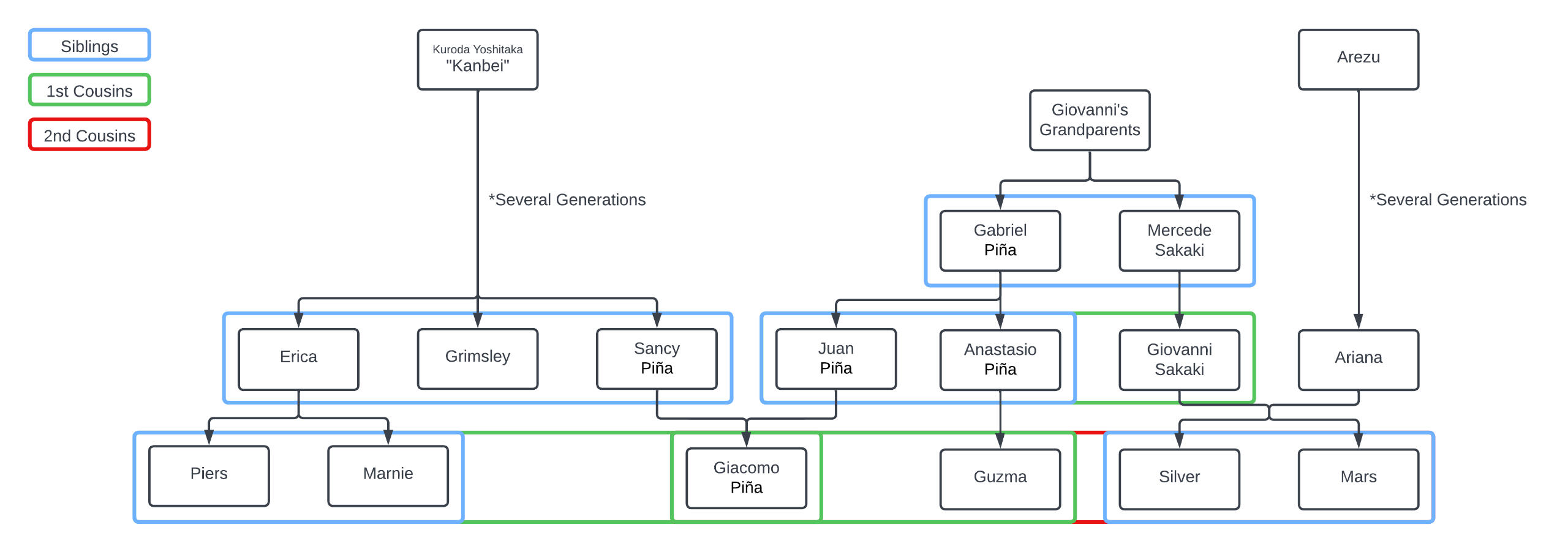 • He got his start as DJ Vice making remixes of Piers' music, unaware of their familial relationship. Piers hired him to do professional mixing and composition, and they eventually pieced together that their mothers are sisters. Giacomo hasn't visited Galar to see the Spikemuth siblings, but he talks with them on the phone now and then. He also makes some popular Team Yell fancams on an alternate account, to hype his family up.